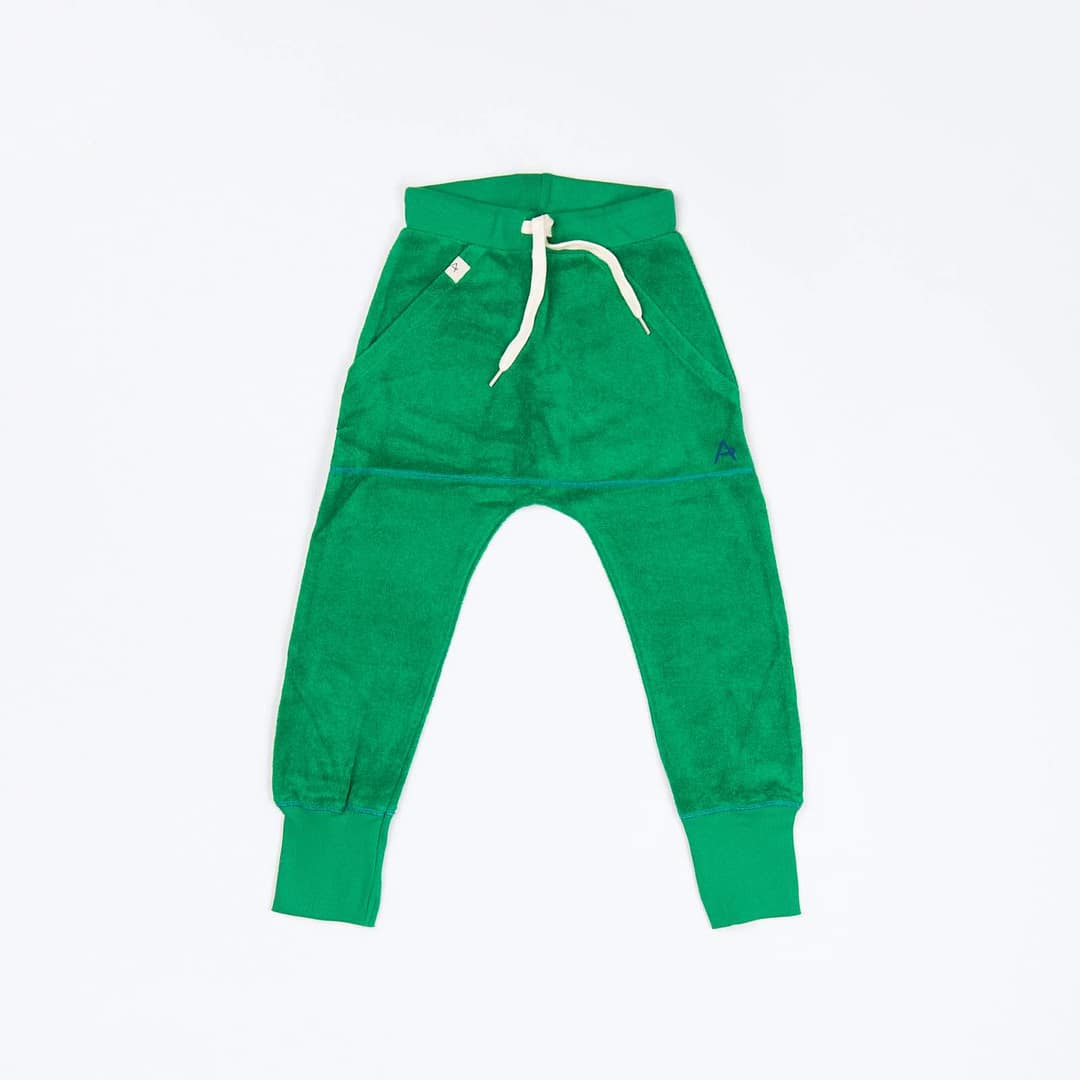 Super comfortable kids pants in Jelly Bean Green organic terry cotton by Alba of Denmark. 75% Organic Cotton, 25% Recycled Polyester
