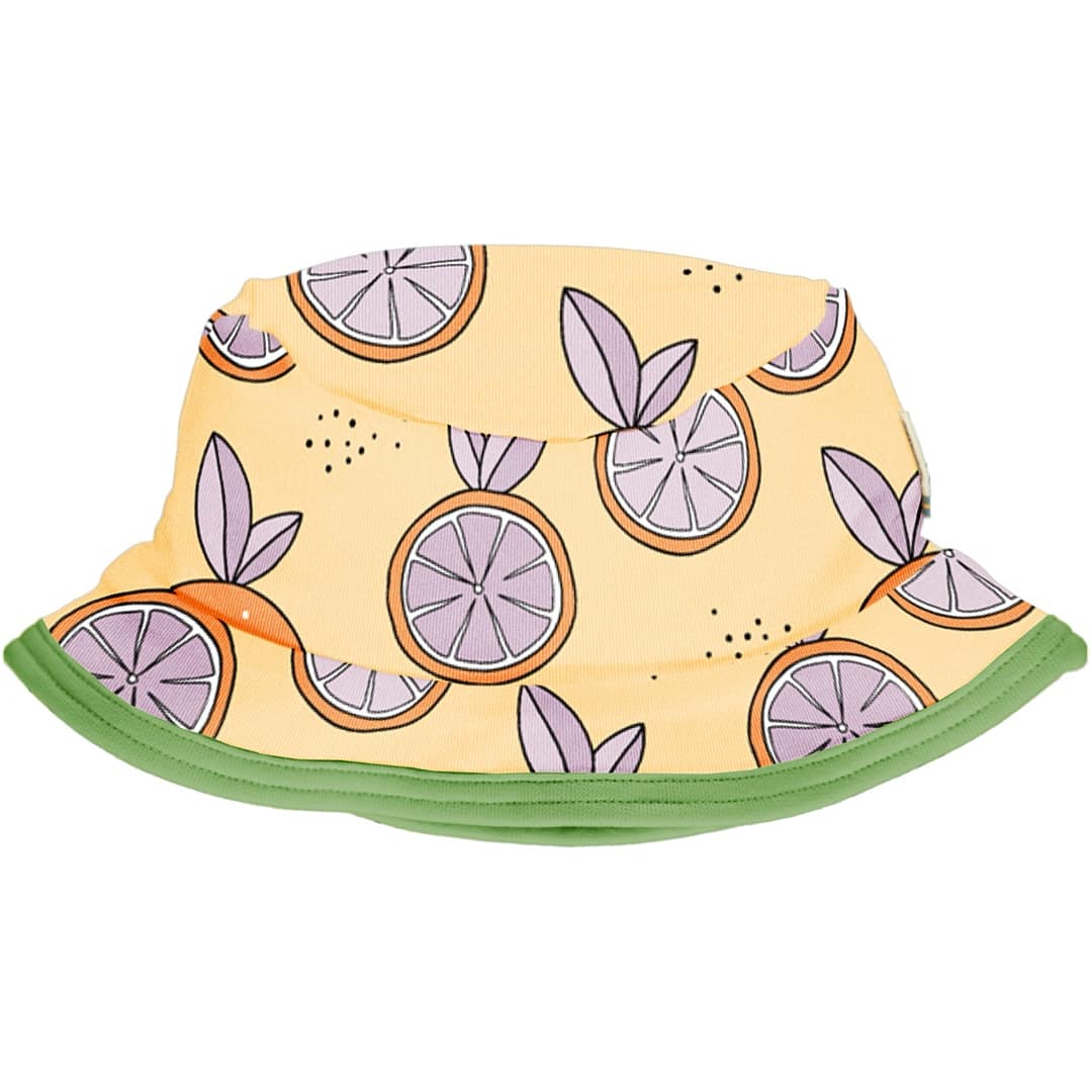 Citrus print on ethical organic cotton sun hats by Meyadey. These organic cotton hats are suitable for sensitive skin because there are no chemical nasties. Bright and colourful Scandi children’s prints created by Meyadey, sister brand to Maxomorra, GOTS organic certified ethical clothes brand. 95% organic cotton 5% elastane (for a little bit of stretch). Sizing: The label inside this garment refers to the head circumference. GOTS Certified brand – Meyadey Care: Machine washable max 40c, do not tumble dry