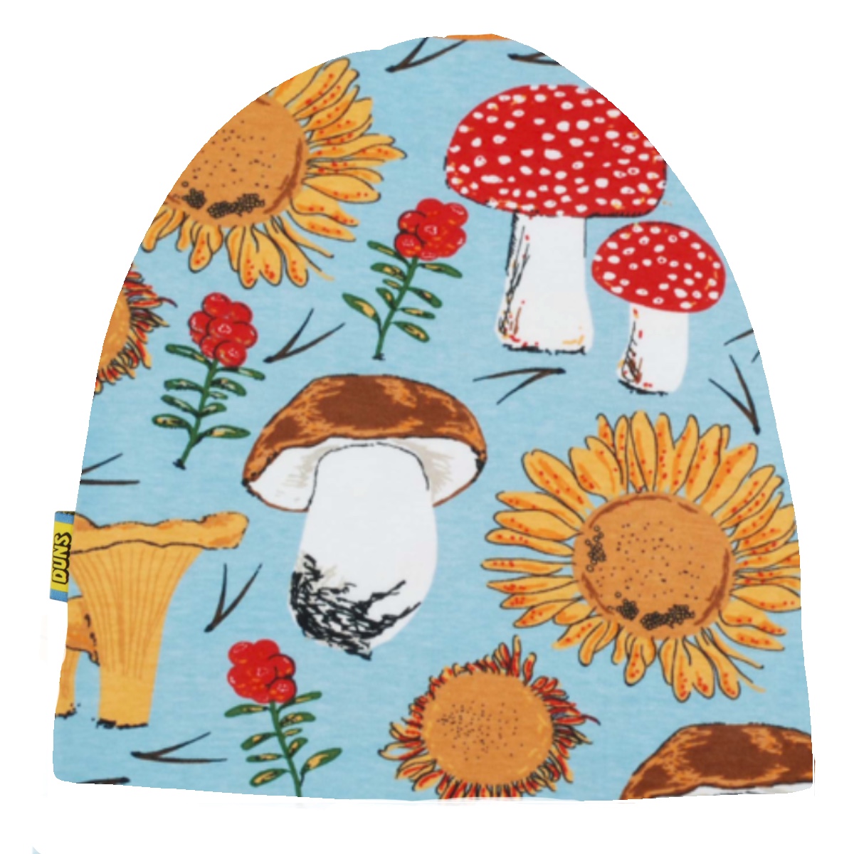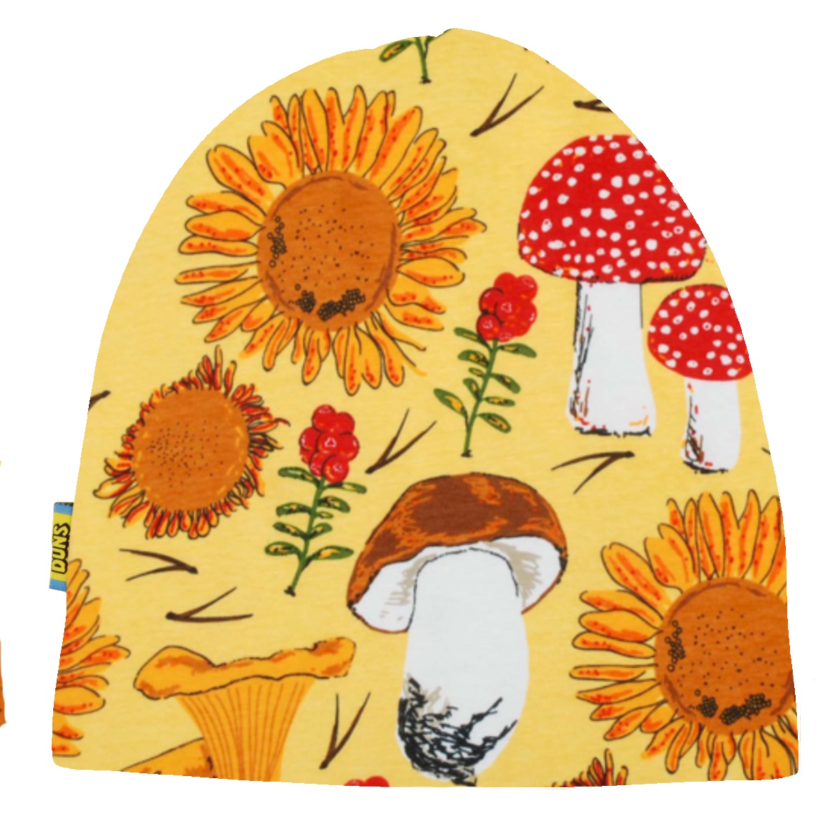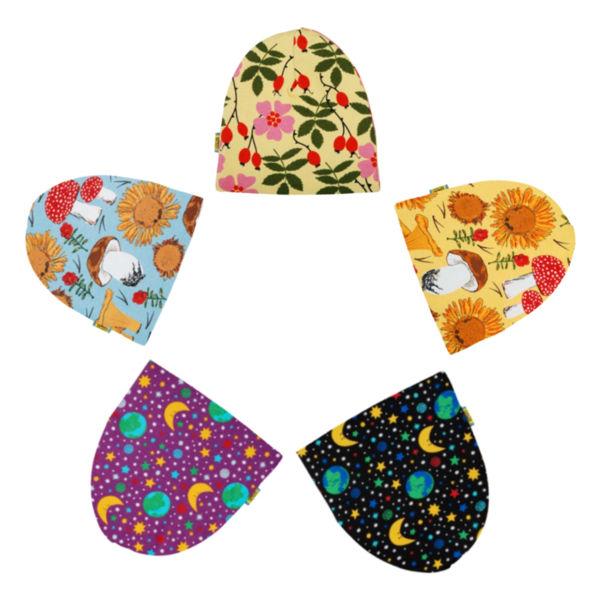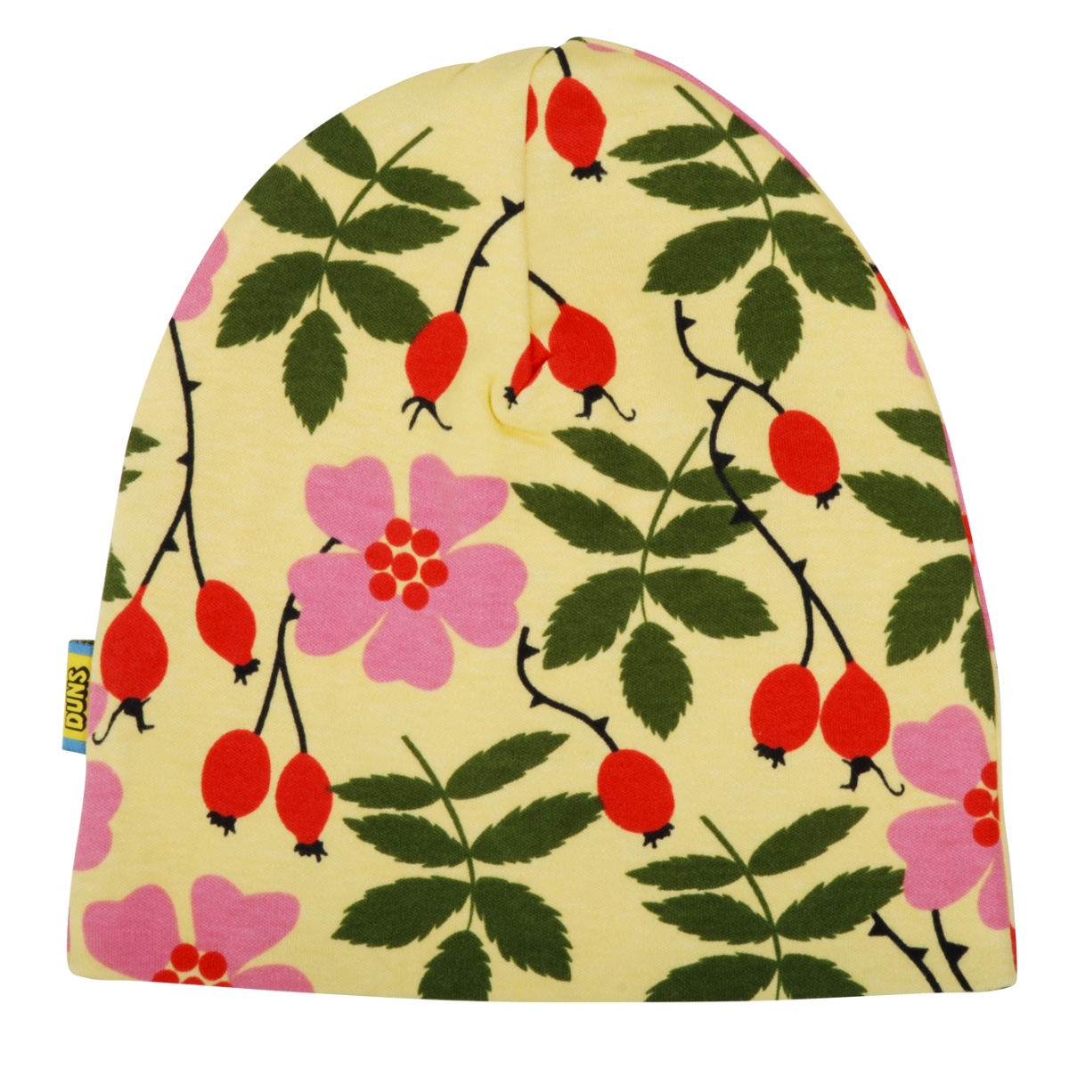 Fabulous and funky Scandi prints on beany hats by DUNS Sweden – perfect for chilly seasons. Available prints include Sunflower Mushroom in blue or yellow, Mother Earth in black or violet or Rosehips. These hats are suitable for sensitive skin and eczema sufferers because there are no chemical nasties. Unisex and ethical Scandi design by DUNS Sweden, a GOTS organic certified Scandinavian clothes brand.
