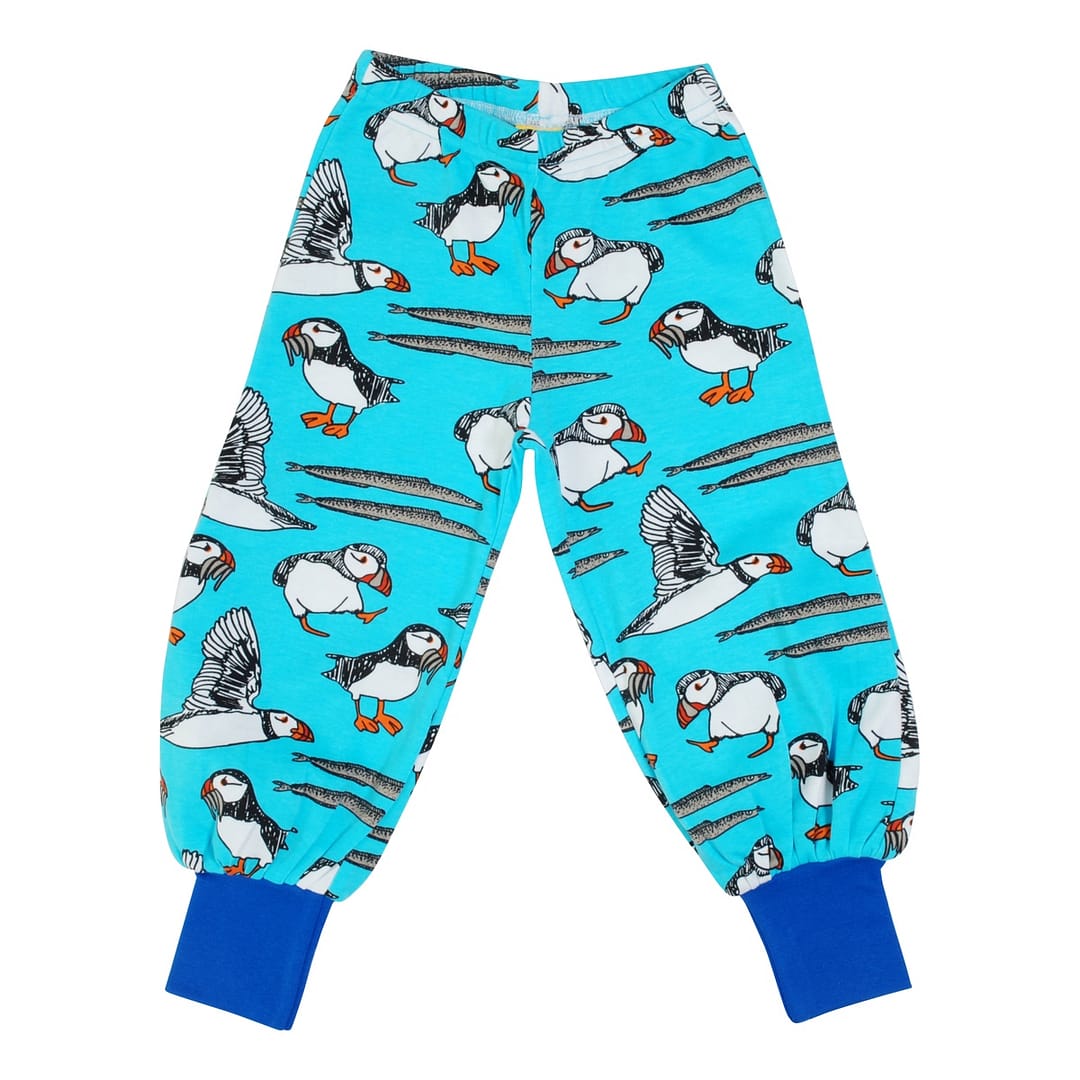 DUNS Sweden puffins on blue organic cotton baggy trousers
