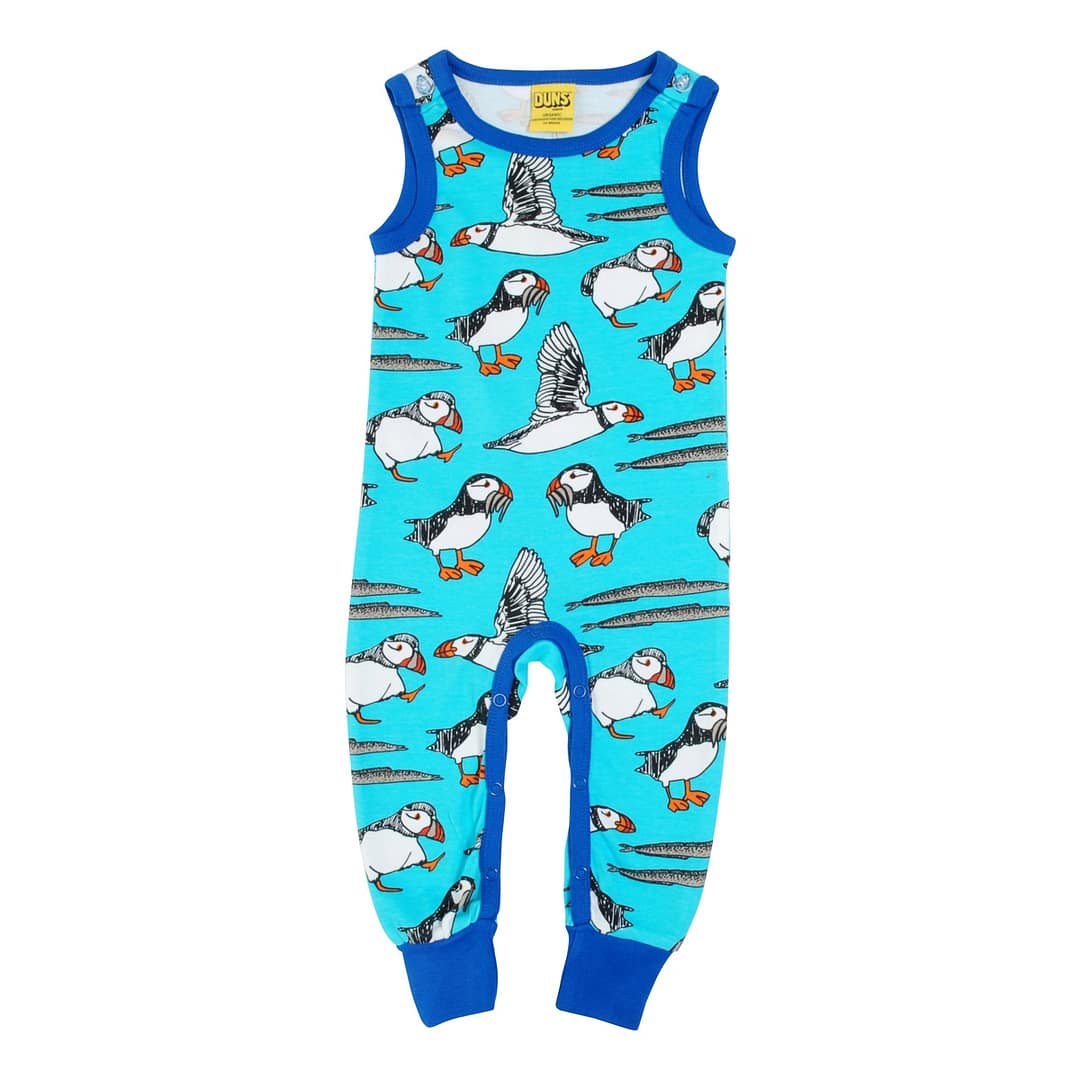Puffins print on blue organic cotton dungarees by DUNS Sweden