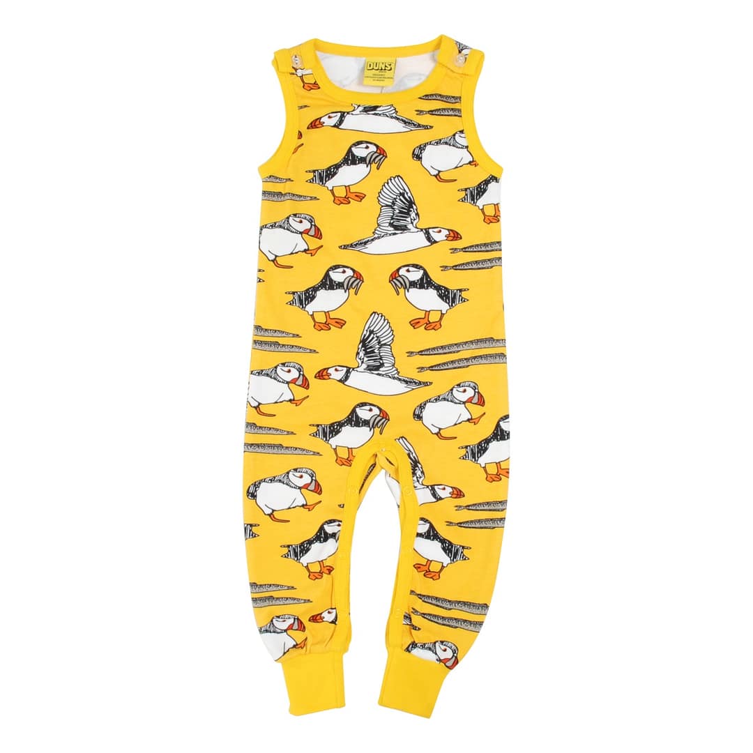 Puffins print on yellow organic cotton dungarees by DUNS Sweden