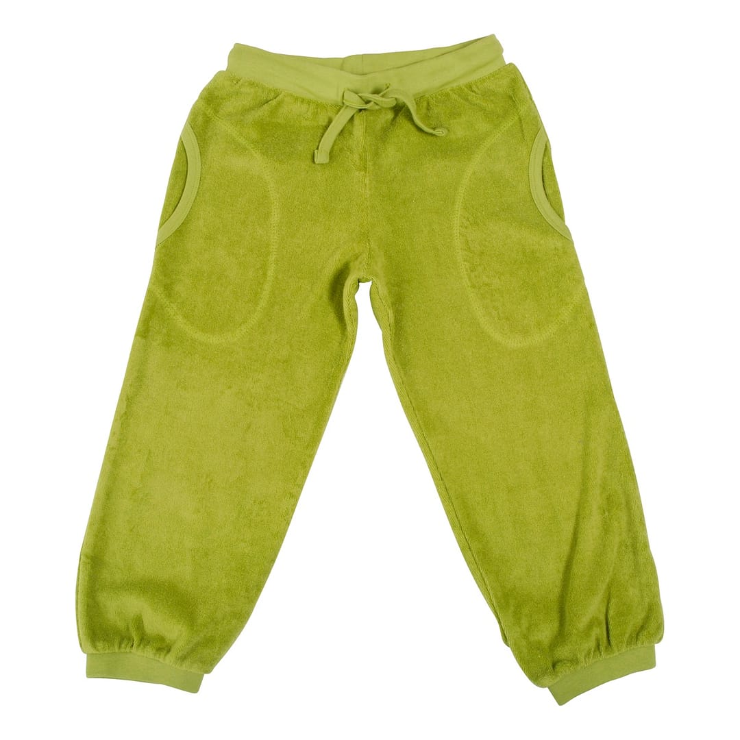 DUNS Sweden plain spinach green comfortable fit organic cotton terry cuffed trousers with side and back pockets and drawstring waist. We also stock these in adult sizes. They are suitable for sensitive skin and eczema sufferers because there are no chemical nasties. DUNS Sweden is an ethical GOTS organic certified Scandinavian clothes brand. 100% organic cotton.