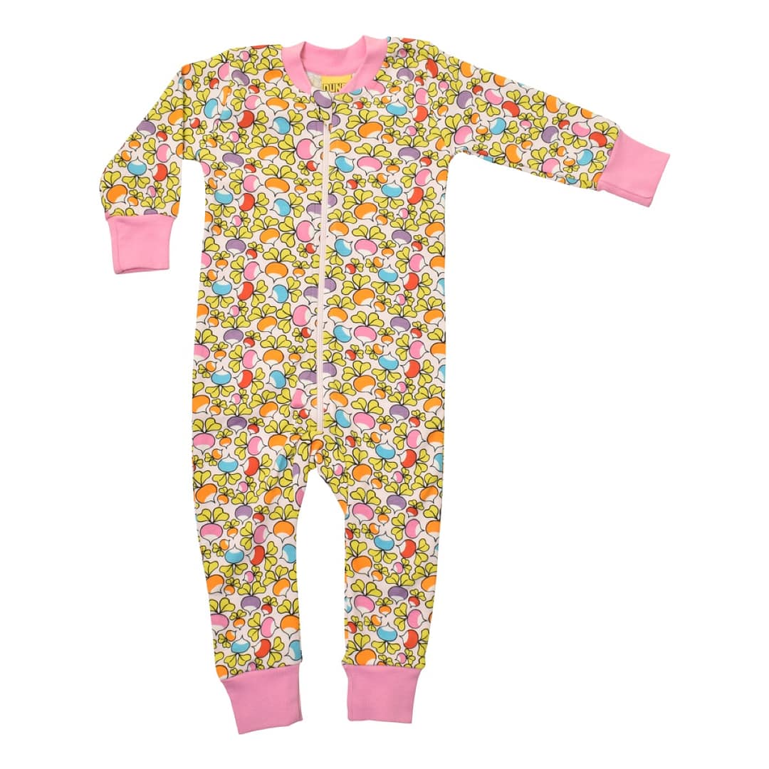 Jumbled rainbow radishes print on pink organic cotton zip onesie by DUNS Sweden