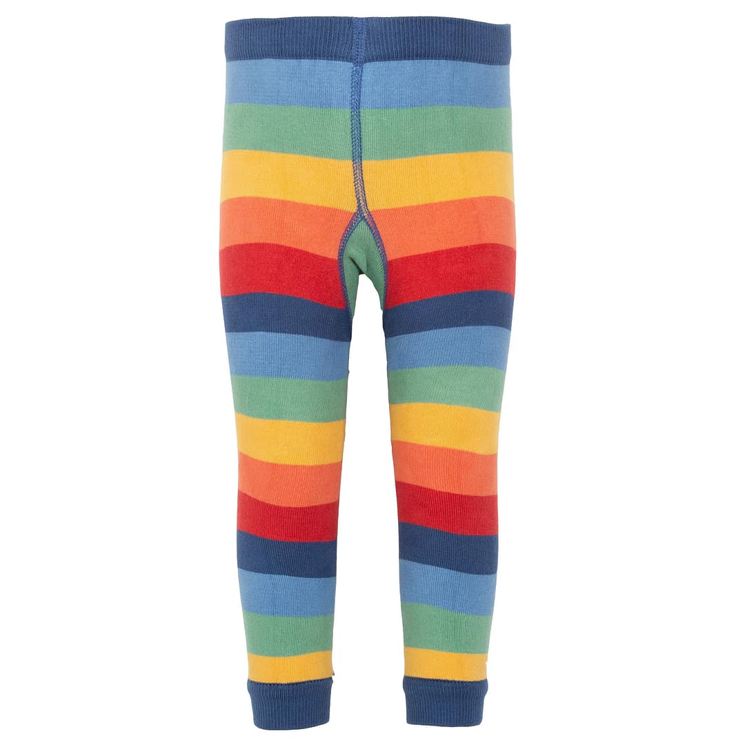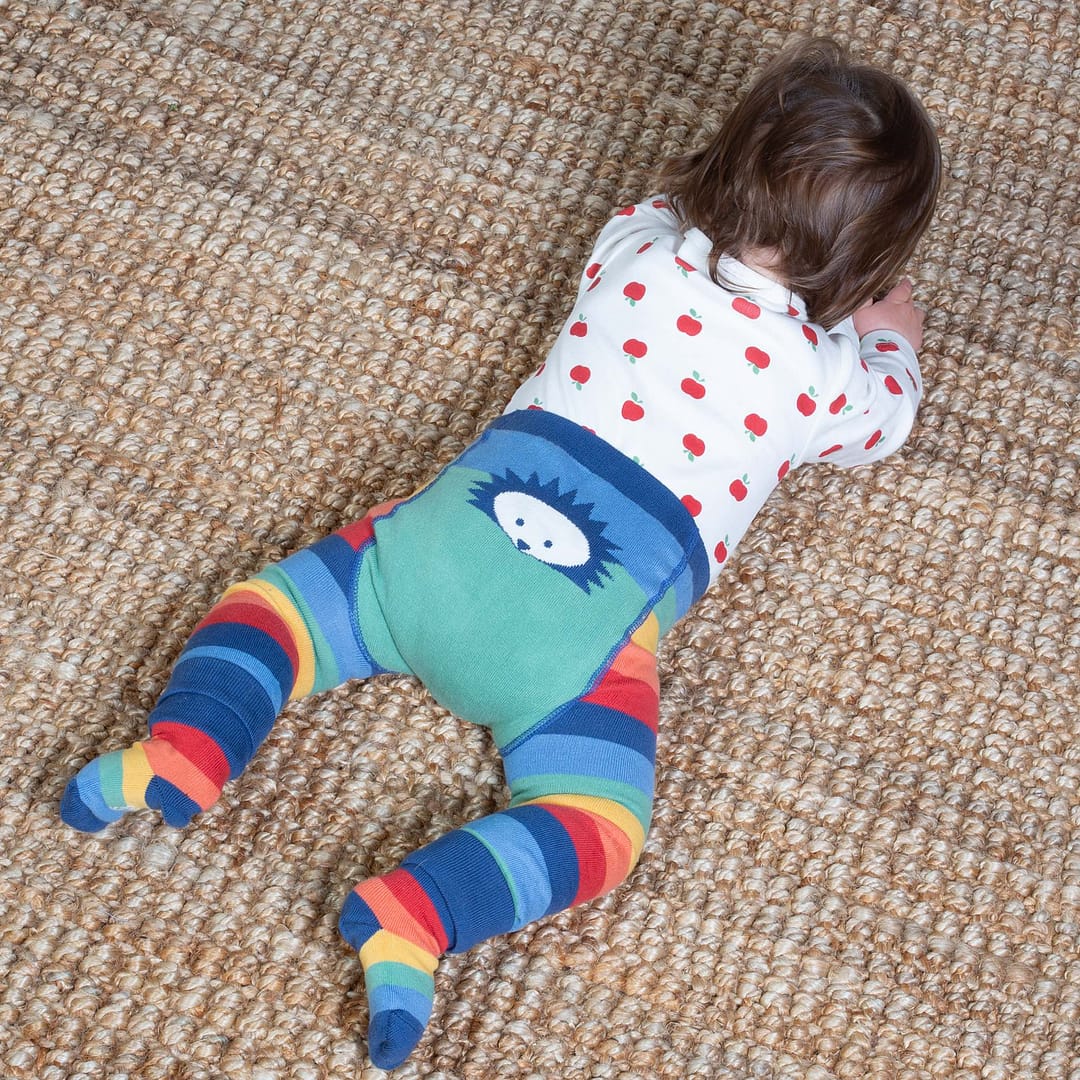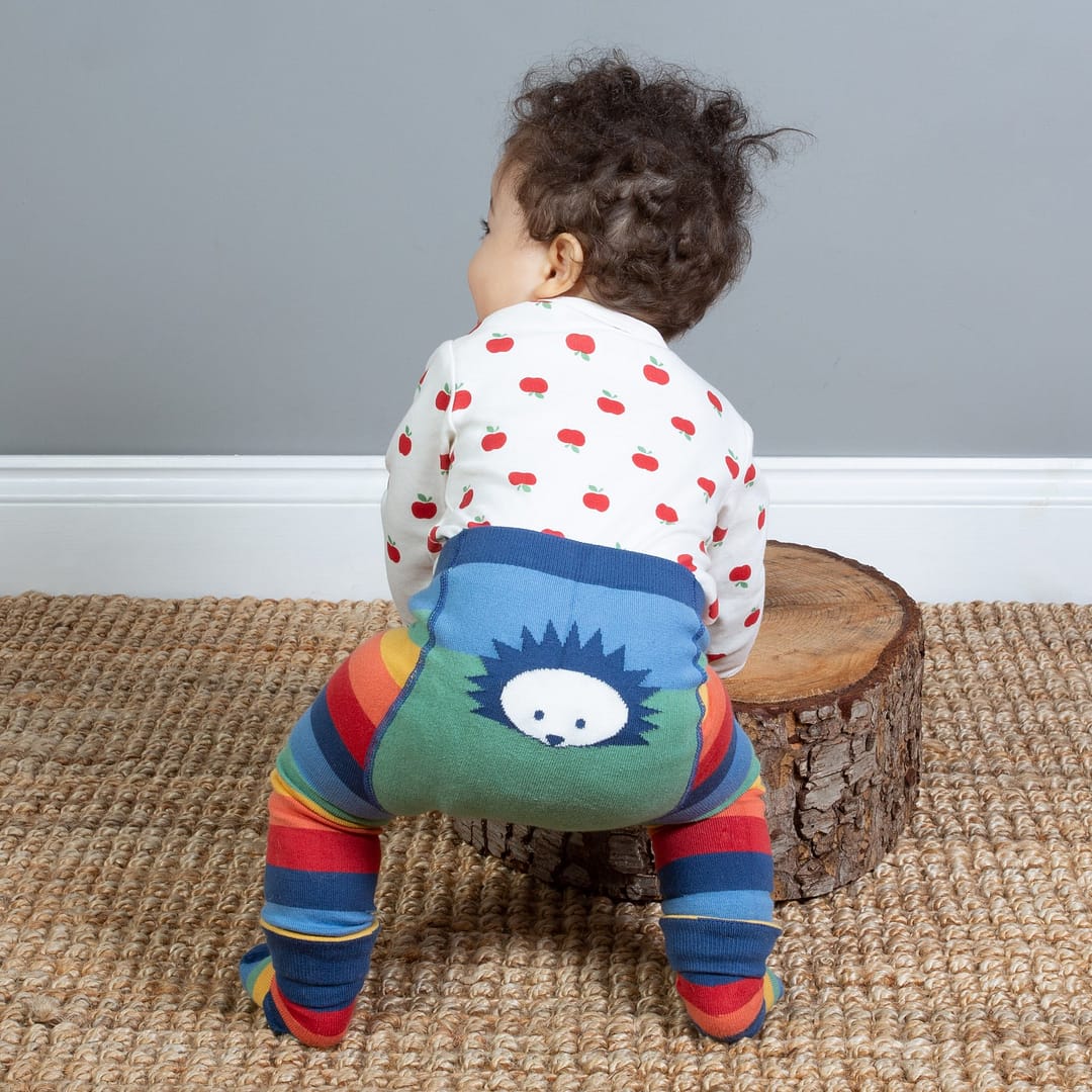 Super soft knitted leggings with rainbow bright stripes and hedgehog design. For ease and comfort pull them on with a t-shirt, bodysuit or dress. Created with a hedgehog design on the seat to make them extra special.