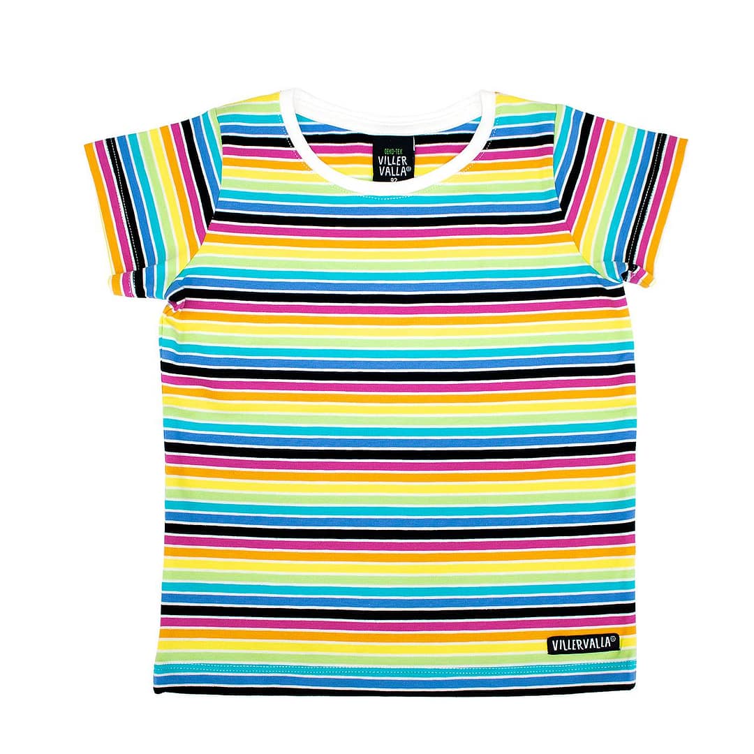 Stripy organic cotton tee.Bright unisex clothes designed by Villervalla, an Oekotex certified Swedish manufacturer.